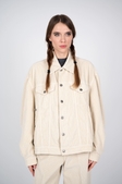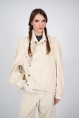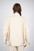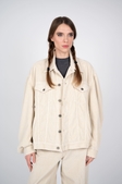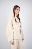 Ця куртка з м'якого вельвету молочного кольору створена для тих, хто цінує невимушений стиль. Має довжину до лінії стегна. Її можна носити двома способами: класично застебнувши по центру або асиметрично, переносячи лінію застібки на бік-силует одразу стає більш концептуальним.Вільний крій дає легкість руху, а дві фронтальні кишені з металевими гудзиками додають виробу характеру та довершеної функціональності. Класичний комір підкреслює стриману елегантність, яка контрастує з м'якою фактурою вельвету.