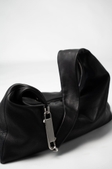 Сумка Cropped Gemini має м'який А-силует, який характерно провисає посередині. Верх вигнутий так, щоб формувати ручку, яка фіксується подвійним карабіном із гравіруванням логотипу Rick Owens. Модель застібається на верхню блискавку, оснащена внутрішньою кишенею.
