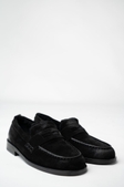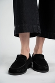 Стильні лофери з м'якої чорної замші з делікатним ефектом потертості, що надає взуттю благородного вінтажного вигляду.