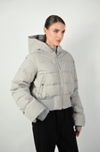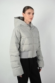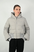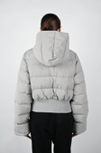 Коротка куртка з капюшоном в сірому кольорі, виконана з легкого нейлону. Модель має центральну блискавку з верхньою кнопкою, капюшон, горизонтальну простьобку та м'який наповнювач для комфорту й тепла. Має фірмовий бавовняний ремінець із заклепкою на спинці. Ця куртка поєднує впізнаний дизайн Rick Owens, технологічність і свідомий підхід до виробнитства.