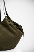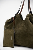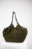 Великий шопер, виготовлений із м'якого замша, поєднує об'ємність із чіткою конструкцією. Зібрана верхня частина пом'якшує його геометричні лінії, а ручки, натхненні ремінним дизайном, додають улітарного характеру. Усередині розташована знімна пласка кишеня, створена для щоденних необхідних речей. На передній частині розміщені фірмові чотири стібки Maison - антипод традиційної етикетки.