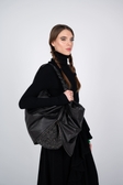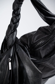 Шкіряна сумка оснащена блискавкою, що проходить уздовж драпіровки, дозволяючи змінювати силует під час розстібання та відкривати підкладку з твіду. Коротші відрізки блискавки виконуюють додаткову функцію кишень. Матеріалом служить розкішна гармент-шкіра у поєднанні з британським твідом, при цьому природні особливості шкіри можуть проявлятися у вигляді легких слідів чи відтінкових відмінностей.