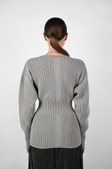 Светр Dafne подовженого крою, нижче лінії стегон, з довгими рукавами. Має об'ємний силует, який підкреслюється широкою джакардовою резинкою на талії. Відмінні риси модели - піднятий човникоподібний виріз горловини, широкі плечі та вільні рукави, що звужуються до вузьких манжет. Дизайн виколнаний у техніці Megarib, з широкими вертикальними рубчиками. На спині - фірмова вертикальна лінія вздовж хребта.